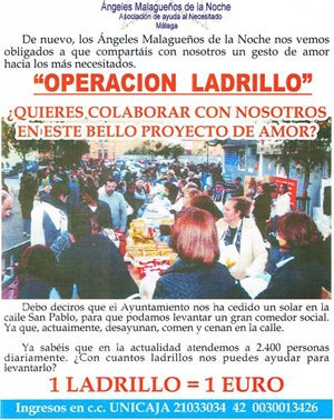 Para ello pusieron en marcha la campaña Un ladrillo, un euro, que busca la solidaridad de los malagueños para poder levantar una sede en la calle San Pablo en la que ubicar un comedor. El presupuesto inicial previsto para la construcción del mismo podría llegar a los 300.000 euros e incluso ya se han ofrecido hasta 4 arquitectos de forma gratuita para llevar a cabo el proyecto, según asegura su presidente Antonio Meléndez.