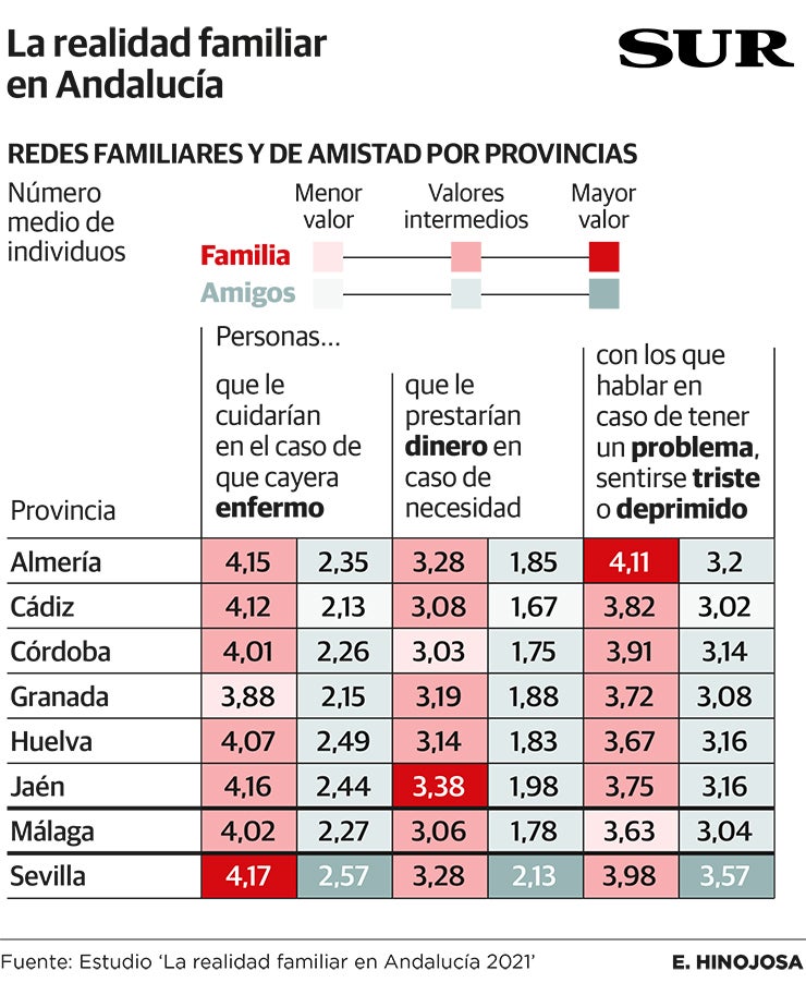 En esencia, ese informe confirma un cambio familiar en la región en los últimos años, en línea con los experimentados en el resto del país pero con un peso específico y más importante del concepto de familia. En este sentido, Andalucía sigue siendo una tierra donde la cultura familiar está profundamente arraigada, «teniendo en cuenta también el fenómeno de que las unidades familiares cada vez están integradas por menos personas, que cada vez hay menos hermanos y que las formas de vida familiar son más plurales», ha indicado Ayuso. El director del informe se ha referido en concreto a la «red de apoyo familiar», que en el caso de la mayoría de los encuestados está integrada «por tres familiares y dos amigos, a los que se recurre en caso de necesidad por estar enfermo o necesitar apoyo económico o emocional». Este primer dato es importante y representa una notable diferencia con respecto al resto del país, donde se da más importancia a los amigos que a la familia en caso de necesidad. «También es importante -ha añadido el profesor- porque esa red, aunque invisible, protege frente a las crisis».
