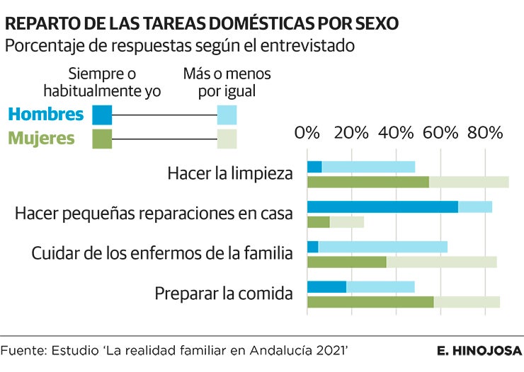 De puertas adentro, la desigualdad sigue estando presente en los hogares andaluces, tal y como se recoge en el capítulo de la 'Dinámica familiar' del informe, aunque con avances con respecto a encuestas similares realizadas en los últimos años. En este sentido, el director del estudio, Luis Ayuso, matizó que este tipo de preguntas sólo se han formulado a mujeres, que a pesar de que admiten que ha descendido esa visión de que las tareas domésticas es cosa de ellas, «el 66% de las encuestadas entre 50 y 56 años siguen asumiendo en solitario la limpieza de la casa». El avance se constata en el hecho de que en mujeres de 18 a 29 años, este porcentaje desciende al 31%.