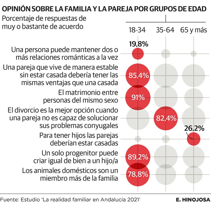 Los valores, el impacto del Covid en el hogar, las dinámicas familiares, la importancia de las nuevas tecnologías, los proyectos de pareja, las demandas en ... políticas públicas, el papel de los hijos o la figura de los abuelos son sólo algunos de los prismas desde los que se pueden contemplar las familias actuales. En el caso de Andalucía, todos ellos aparecen recogidos en 'La realidad familiar en Andalucía 2021', el primer gran estudio monográfico sobre esta institución, sus opiniones o sus actitudes y comportamientos en las esferas públicas o privadas. El informe, con miles de datos que darían para estudios específicos por separado, está impulsado por la Fundación Centro de Estudios Andaluces (CENTRA) y dirigido por el profesor titular de Sociología de la Universidad de Málaga Luis Ayuso, en colaboración con las investigadoras Olga Jiménez y Nadia Khamis.