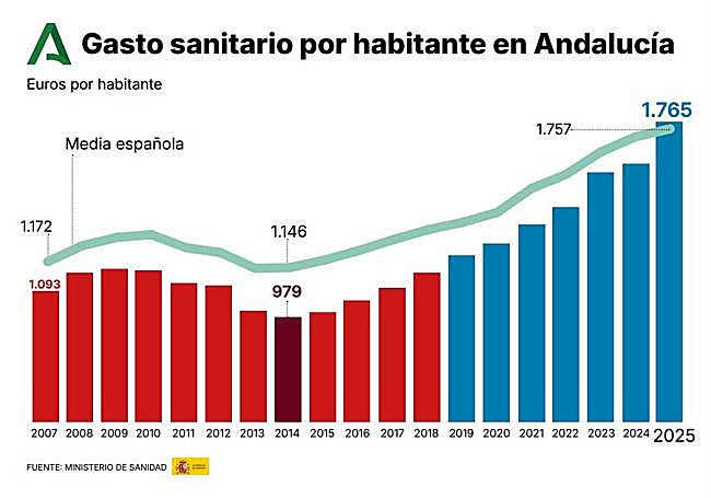Llegó a estar en último lugar, con 979 euros por habitante y año en 2014, pero once años después Andalucía ya ha conseguido situarse por ... encima de la media española de gasto sanitario por habitante. No se trata de datos de la Junta de Andalucía, sino del Ministerio de Sanidad, que refleja que por primera vez en la historia lo que la comunidad destina a gasto sanitario por número de habitantes supera la media nacional.