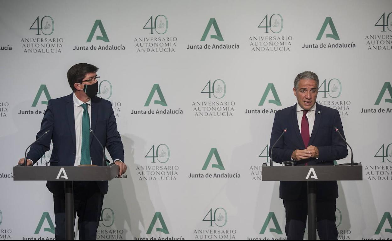 el vicepresidente de la Junta y consejero de Turismo, Regeneración, Justicia y Administración Local, Juan Marín, y el consejero de la Presidencia, Administración Pública e ... Interior y portavoz del Gobierno andaluz, Elías Bendodo, comparecen en la rueda de prensa posterior a la reunión del Consejo de Gobierno.