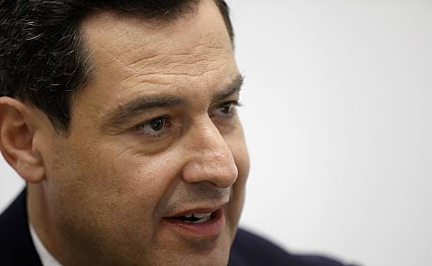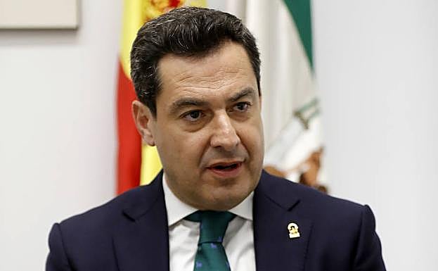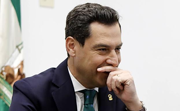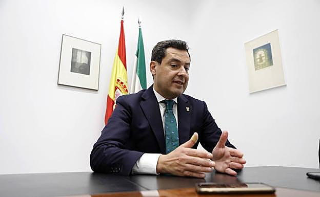 Cae la tarde en los patios del antiguo Hospital de las Cinco Llagas, sede del Parlamento de Andalucía. Y el sol provoca un juego de ... luces y sombras bajo las inmensas palmeras washingtonias que se empinan hacia el cielo. Suena el timbre que anuncia que hay votaciones en el hemiciclo y comienzan a entrar parlamentarios ausentes en el pleno. Entre ellos, el presidente Moreno Bonilla, que baja de su despacho en la primera planta. Un grupo de escolares andaluces que participaban en Sevilla en un torneo de debate aguardan al presidente para inmortalizar la visita. Tras la foto de grupo, llegaron los selfies. Uno, otro, otro más. Moreno Bonilla no pierde ni la sonrisa ni la compostura. Termina y nos encaminamos a la sala para realizar la entrevista mientras hablamos de la visita del Rey Felipe VI en los Premios Taurinos y Universitarios que anualmente concede la Real Maestranza de Caballería. «Este es un país muy complicado, muy frentista, y necesitamos un árbitro que esté por encima de las siglas, de las trincheras ideológicas, y esa figura es el Rey, la Reina, la Casa Real». Tras subir las empinadas escaleras, Juan Manuel Serrano hace las fotos. Un posado en toda regla. Se ajusta el traje y la corbata verde, color habitual en los encuentros con el Rey. Y color andaluz. Se detiene junto al cuadro con la bandera blanca y verde en la que Juan Genovés pintó a los andaluces caminando hacia su referéndum en 1980 y que hoy es un símbolo del andalucismo. Entramos y comenzamos la entrevista. Entre ambos, unas botellas de agua y una palmera grande de chocolate que nos disponemos a compartir. «Están riquísimas», dice el presidente. Y estaba en lo cierto.