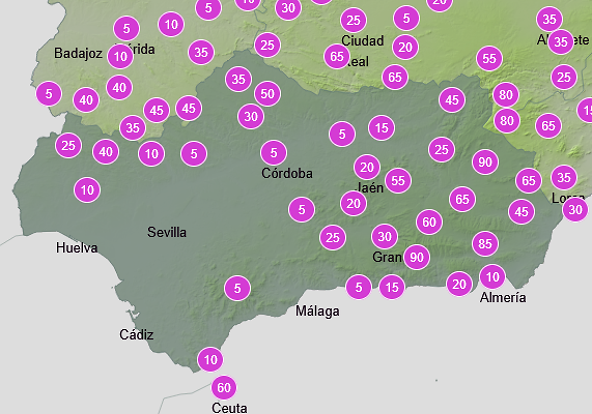 El ecuador de octubre estará marcado por la llegada de posibles lluvias a Andalucía. Eso sí, de momento todo apunta a que serían chubascos «ocasionales» ... que podrían irrumpir acompañados de tormentas. La mayor probabilidad, a tenor del pronóstico de la Agencia Estatal de Meteorología (Aemet), se registrará el jueves hasta las 18.00 horas en áreas del interior de la comunidad (especialmente de Granada, Almería o Huelva).