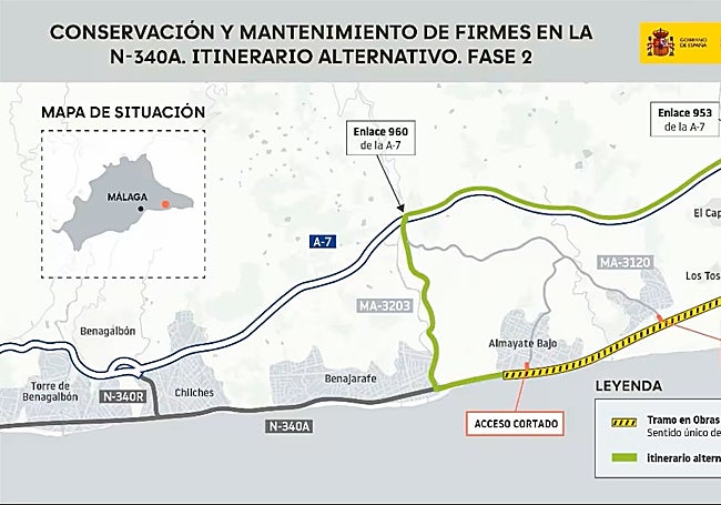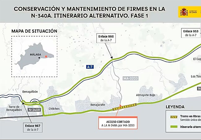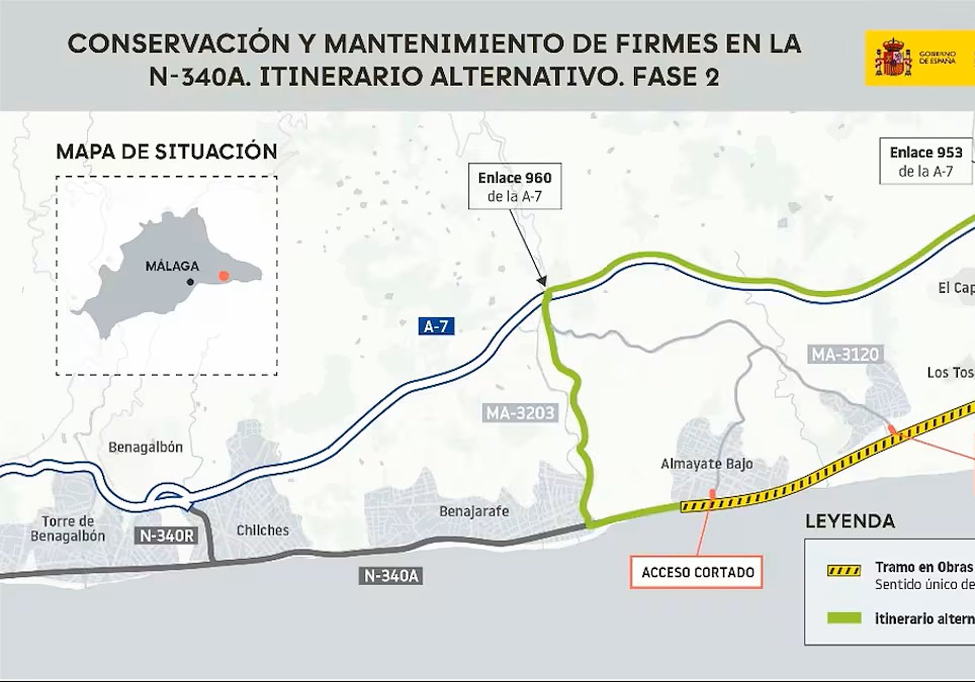 Los trabajos se ejecutarán en dos fases. En la primera fase 1, del 4 al 11 de noviembre, entre los kilómetros 262,7 y 264,8, con corte del acceso a la N-340A por la carretera comarcal MA-3203. En la segunda fase 2, del 12 al 21 de noviembre, entre los kilómetros 264,8 y 269,3, también con restricciones en el acceso desde la MA-3203. Para mantener la fluidez del tráfico, se habilitarán itinerarios alternativos debidamente señalizados a través de la autovía A-7, entre los enlaces 953 y 967 durante la fase 1, y entre los enlaces 953 y 960 durante la fase 2.