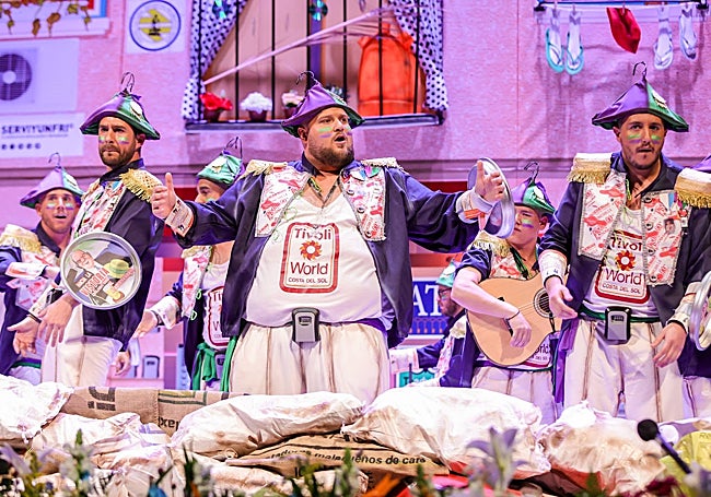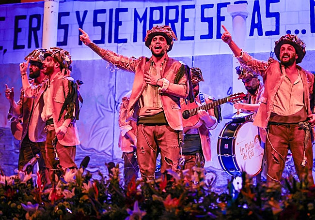 Los murguistas se presentan al grito 'Que vienen los güiris' que canta el teatro con el telón aún bajado. Ellos viven atrincherados en su piso, el único del bloque que no se dedica al alquiler turístico. «Hasta el portero está mosqueado porque lo han cambiado por un candado», dicen. En sus pasodobles se quejan de esas personas que están todo el día con el 'bro' en la boca cuando hay algo tan malagueño como 'pichita' y piden dejar atrás los complejos respecto al Carnaval de Cádiz. Mucho arte en los cuplés, donde hablan del cartel de la Semana Santa de Sevilla y la copia de Merchán y los problemas de las tallas en el Shein.