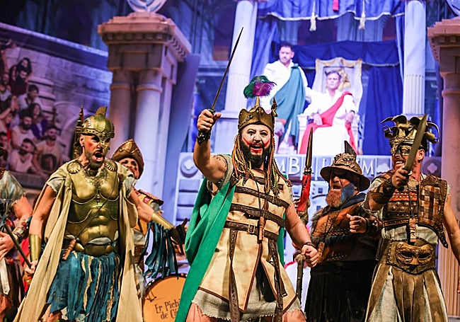 Los comparsistas se convierten en gladiadores romanos que se bajan a la arena para pelear ante el César con sus coplas y gargantas. La puesta en escena y el atrezzo es una pasada. En sus pasodobles hablan de la Iglesia, sus abusos y lecciones de moral (»Sepa señor Obispo que nos veremos ardiendo juntos en el mismo infierno»), y sobre la importancia de decir te quiero, algo que ellos le dirían a su madre. Originales estribillos, que cambian tras cada uno de los cuplés.