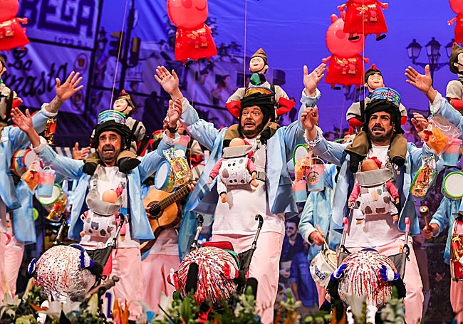 La primera sesión de semifinales fue inaugurada por dos agrupaciones infantiles, algo que se repetirá durante las próximas jornadas. Ambas cautivaron a los espectadores del teatro, lo que demuestra que la cantera llega cada año con un poco más de fuerza y entusiasmo. Los componentes de la primera, 'Los mentirosillos' se metieron en la piel de unos pinochos de madera, y el segundo fue un romancero, que interpretó una graciosa misa carnavalera con padre nuestro incluído.