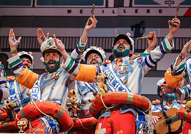 Los patrones del Melillero se presentan con los flotadores y los manguitos colocados en un barco que si fuera un coche sería un Dacia. Muy graciosa la actuación de estos murguistas que cantan atracados desde el Muelle Uno. Pasodobles para pedir que no falten grupos punteros en los próximos carnavales y para criticar la torre del Puerto, que va a tapar la Farola y reducirá nuestra historia.