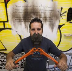 En el primero, el radiocasete lleno de pintura que Montijano coloca bajo el caballete cuando pinta, sus anotaciones para los proyectos, los metros de soga que compra en una tienda a la ribera del Guadalmedina donde deben pensar que está loco. A la izquierda, el pasamontañas, las tenazas enormes, los botes de spray y las bambas negras de D.Darko, más amigo de mirar que de hablar. Aun así, se arranca: «Hemos querido usar el espacio hasta los últimos límites». Ese uso del espacio, el viaje de ida y vuelta que ambos emprenden entre la escena pública de la calle y el recinto privado de la galería, surge como uno de los vasos comunicantes entre ambos autores.