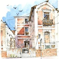 La vecina de enfrente, intrigada por la presencia del dibujante, pega la hebra y proporciona algunas de las claves del caso: «Esa casa está abandonada desde que murió doña Fermina, su última propietaria. Luego la compró un hombre que quiso tirarla, pero el Ayuntamiento no le dejó y le obligó a conservarla. Después llegó la crisis y se quedó así». «Así» quiere decir en un estado lastimoso; la falta de cubrición deja ver el azul del cielo a través de unas ventanas desvencijadas que hace mucho tiempo que perdieron los cristales.