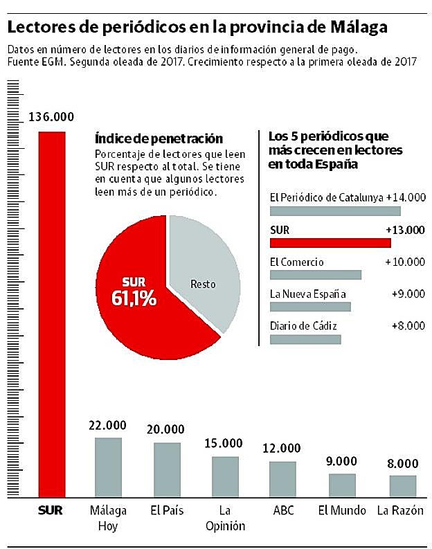 SUR se consolida como el periódico líder en Málaga y se convierte en el diario local que más crece en toda España, según los ... datos de la última oleada del Estudio General de Medios (EGM). En plena transformación de los hábitos de consumo de información, este periódico cuenta cada día con 136.000 lectores diarios, lo que supone respecto a las anteriores estadísticas un crecimiento de 13.000 lectores diarios, el mayor de todo el país entre los medios impresos de información general de pago de ámbito local y regional. Sólo El Periódico de Catalunya (con un crecimiento de 14.000 lectores diarios) ofrece una subida mayor en todo el país.