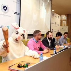 Representantes de las administraciones que apoyan el certamen, el Ayuntamiento, la Diputación y la Consejería de Innovación, también acudieron a la rueda de prensa, aunque el más fotografiado fue el gran icono de esta edición, el Conejito Malo, que semanas atrás protagonizó una campaña en redes sociales que despertó gran atención y polémica hasta que se descubrió que se trataba de un personaje de ficción creado para promocionar el Fancine.
