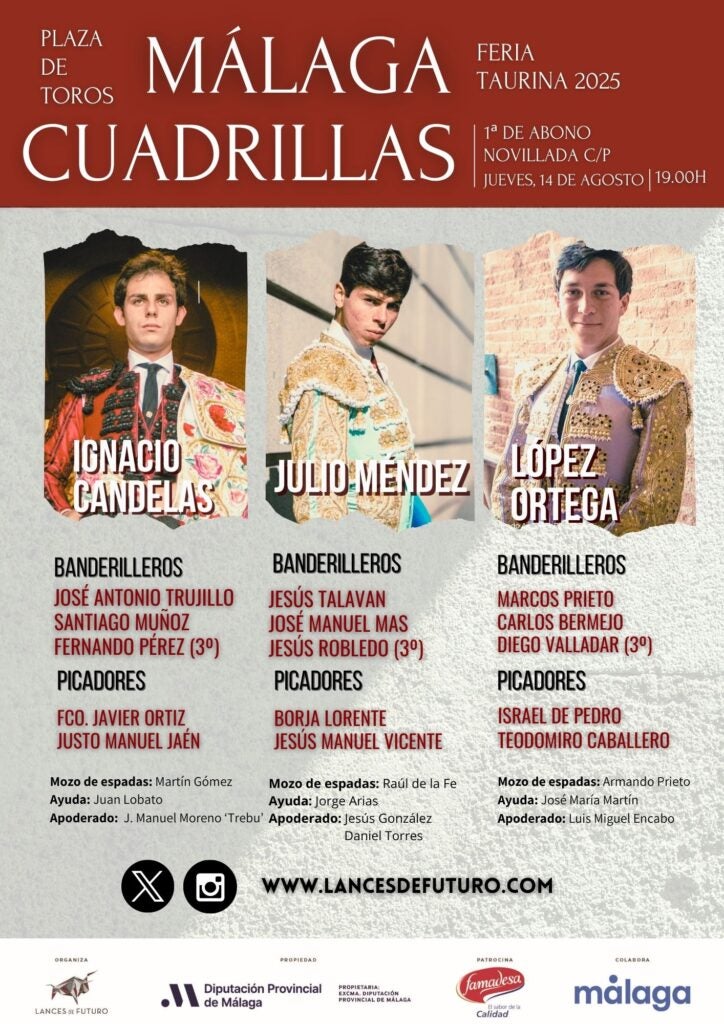 El cartel lo conforman el rondeño Ignacio Candelas, el abulense Julio Méndez y el mexicano López Ortega, que debuta con picadores como ganador, el pasado año, del Certamen Internacional de Escuelas Taurinas 'La Malagueta'.