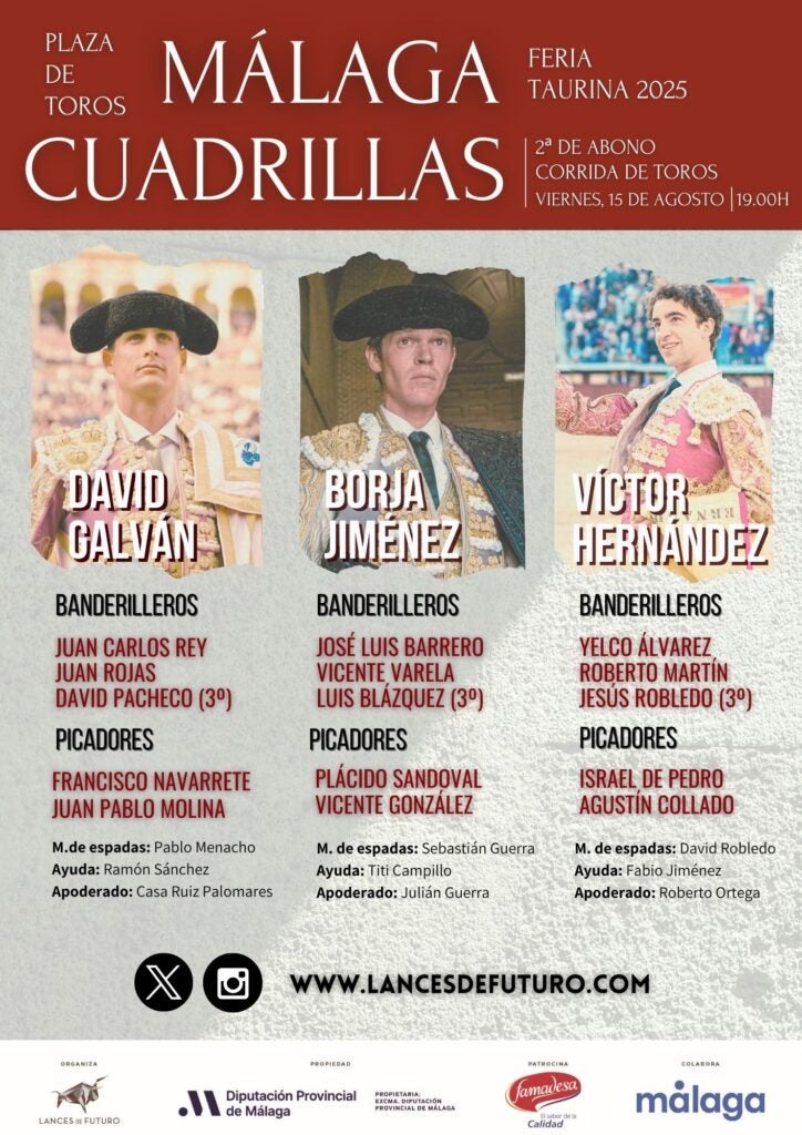 En la que es la primera corrida de toros del ciclo malagueño se lidiará un encierro completo del ganadero Juan Manuel Criado, que estoqueará una terna de jóvenes espadas: David Galván, Borja Jiménez y Víctor Hernández. En el caso de Galván también será su reaparición en los ruedos tras la cogida sufrida a principios de agosto en Perú.
