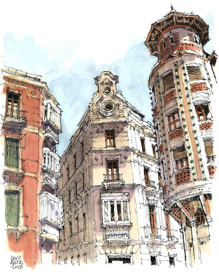 Detrás del Mercado de Atarazanas, donde se cruzan las calles Sagasta y Moreno Carbonero, tres edificios parecen mantener una acalorada charla. El rojizo de ... la izquierda se diría que reprocha a sus vecinos las ansias por destacar, mientras él intenta pasar desapercibido como uno más del centro histórico. El del centro exhibe ufano su remate en esquina, un añadido de principios del XX a la moda de París; en realidad, tal aditamento es lo único que lo distingue del anterior, junto al color de la fachada. El tercero, ajeno en principio a la disputa, interviene al fin, reprochando tal esnobismo afrancesado. En contraposición, él se pavonea de su decoración vernácula: aleros, cerámica vidriada, paños de sebka. Sus interlocutores reaccionan con desdén ante lo que consideran excentricidades, pero al final es el que atrae más miradas.