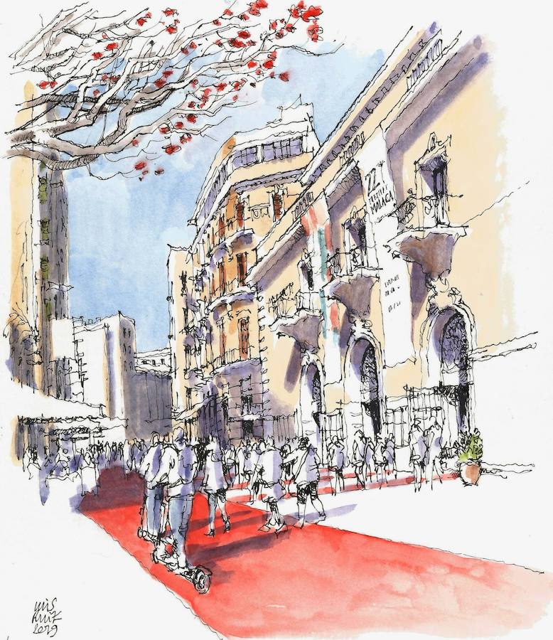 En marzo, calle Alcazabilla se tiñe de rojo. Por aquí discurre la alfombra de ese color que conecta las distintas sedes del Festival de ... Málaga de Cine en Español, que este año celebra su edición número 22. Pero el rojo intenso no se circunscribe al pavimento; también se manifiesta en la copa de los árboles del coral que prosperan en los jardines de Ibn Gabirol, entre las callecitas Postigo de San Agustín y Marquesa de Moya.