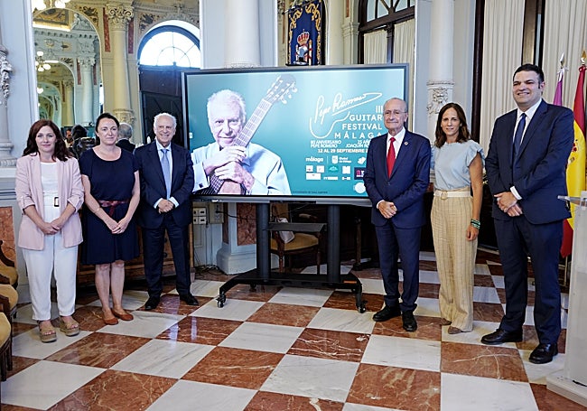 El alcalde de Málaga, Francisco de la Torre, junto a la concejala delegada de Cultura y Patrimonio Histórico, Mariana Pineda, el director del festival Vicente Coves; la responsable de Artes Escénicas de Fundación Unicaja, Gema Domínguez; y el guitarrista Pepe Romero, presentó este lunes el programa de esta edición.