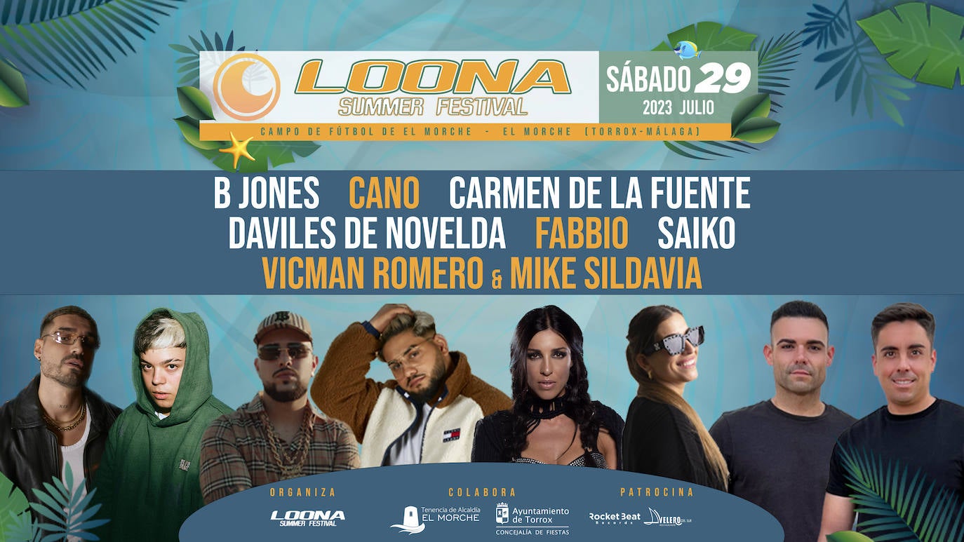Comienza la cuenta atrás para la celebración de la 15ª edición del Loona Summer Festival, que presenta el cartel más ambicioso de su historia ... para el próximo sábado 29 de julio en El Morche (Torrox). Este año los artistas se presentan por sí solos. Daviles de Novelda, Cano, Saiko, Fabbio o Carmen de la Fuente representan una gran apuesta por el género urbano. Pero también permanece una de las esencias del evento, que desde sus inicios ha tratado con cariño la electrónica y esta vez estará a cargo de B Jones y Vicman Romero & Mike Sildavia.