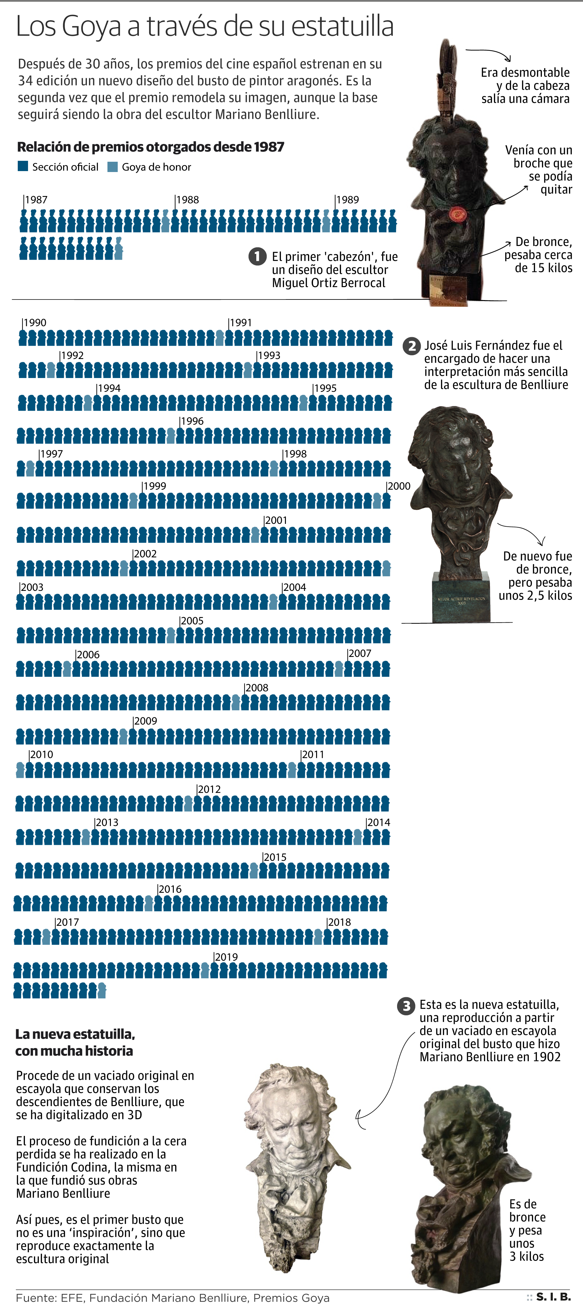 Los 'cabezones' que se entregarán en la 34 edición de los Premios Goya este sábado 25 de enero tendrán un nuevo diseño, el tercero en sus más de 30 años de historia, al contar con un nuevo busto del pintor aragonés, réplica exacta de la obra del escultor Mariano Benlliure y que tendrá una forma «más definida» y más peso que la anterior, según han indicado a Europa Press fuentes de la Academia de Cine.