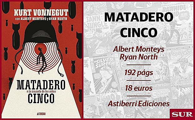 Albert Monteys (¡Universo!, El Jueves) se atreve a adaptar, junto a Ryan North, la novela satírica escrita por Kurt Vonnegut a finales de la década de 1960, 'Matadero cinco'. En ella, Billy, un soldado preso de la Segunda Guerra Mundial, tomará contacto con seres capaces de percibir cuatro dimensiones que le confieren la posibilidad de desprenderse del tiempo y de poder viajar por él. De esta forma, irá viendo ante sus ojos su vida de forma simultánea, profundizando en diferentes aspectos críticos.