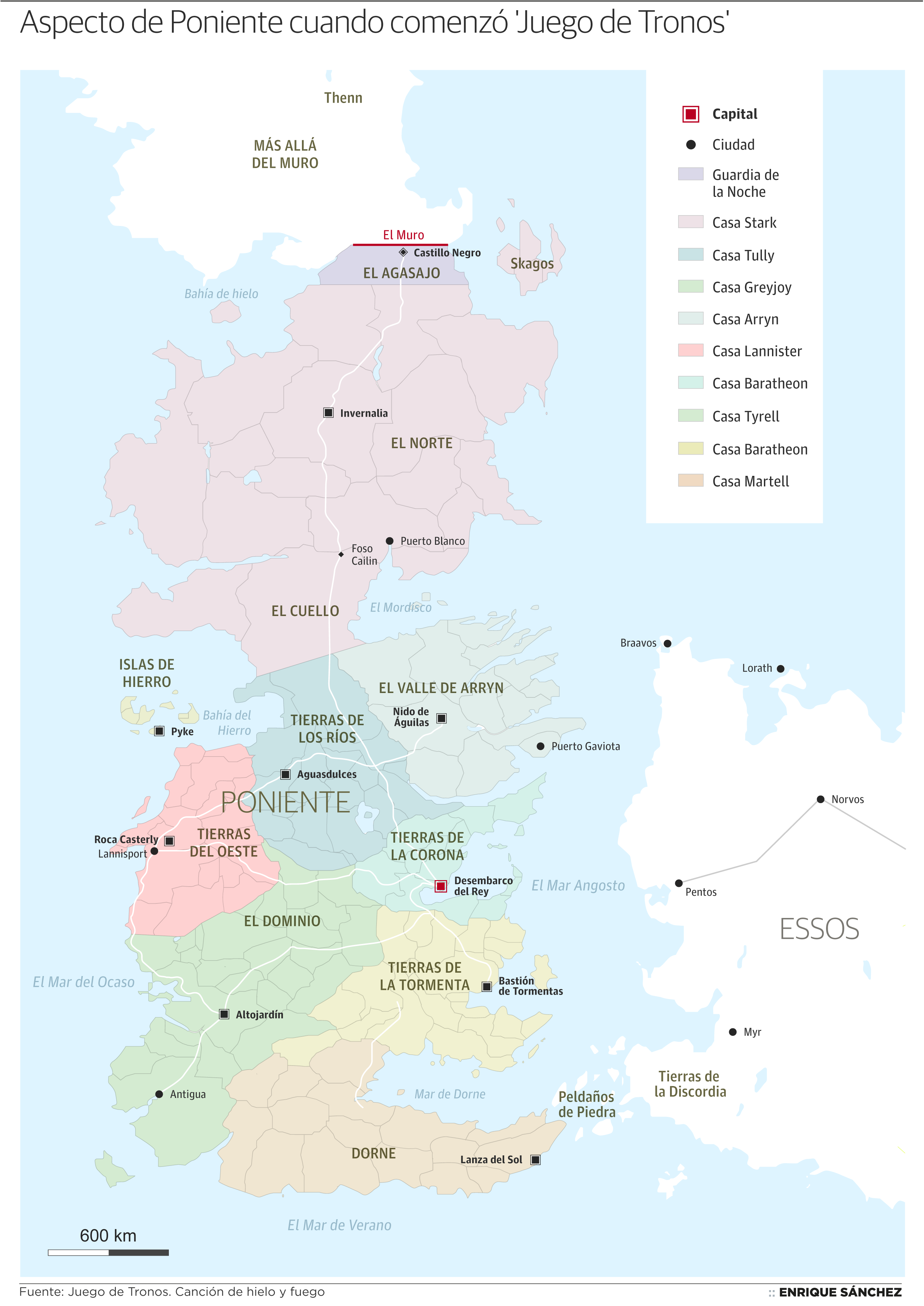 Cuando la serie de HBO comenzó a emitirse, el mapa político de 'Juego de tronos' arrojaba un notable número de colores que daba cuenta de la disparidad de poderes repartidos por los Siete Territorios. Era un lugar aparentemente más diverso, en el que tenían espacio y capacidad de decisión distintas familias, con comportamientos e ideologías diferentes. Un repaso geográfico en la actualidad refleja un panorama absolutamente opuesto, teñido prácticamente por dos tonos, el que representaría a los Lannister, que mantienen los enclaves de mayor influencia, y el que simboliza las zonas donde triunfa la alianza Stark-Targaryen, que avanzan a fin de conseguir dominar el continente. Poniente se ha rendido así al bipartidismo, a una pluralidad más bien escasa.