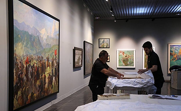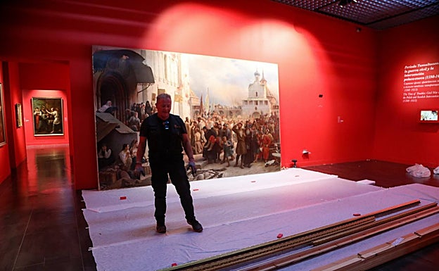 La ilusión de normalidad que ofrecía Chagall se acaba cuando el paso avanza hasta la entrada de la sala. Las cajas se acumulan bajo la reproducción de 'La carga de la caballería roja' de Malévich que introducía al visitante en la colección 'Guerra y paz en el arte ruso'. El título no podía ser más pertinente: la exposición que se inauguró en Málaga en tiempos de calma se despide ahora en pleno conflicto. Las paredes de esta primera muestra (en total son cuatro) están ya casi desnudas de arte, con apenas tres o cuatro lienzos de gran tamaño aún por desmontar. Es una de las señas de identidad del arte ruso, su monumentalidad, con pinturas de varios metros de alto y de ancho que requieren de un procedimiento especial para garantizar su seguridad en el viaje. De estas se hacen cargo los expertos desplazados desde San Petersburgo, habituados a trabajar con ellas. Aquí no hay margen para el error, todo está controlado al milímetro.