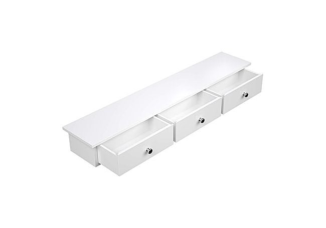 Con tres cajones integrados, este estante flotante de pared SONGMICS proporciona almacenamiento oculto y una superficie para exhibir objetos decorativos. Fabricado en tablero de aglomerado robusto, soporta hasta 15 kg y presenta un diseño moderno en blanco. La instalación es sencilla y los topes de seguridad en los cajones aportan tranquilidad y funcionalidad en cualquier estancia.