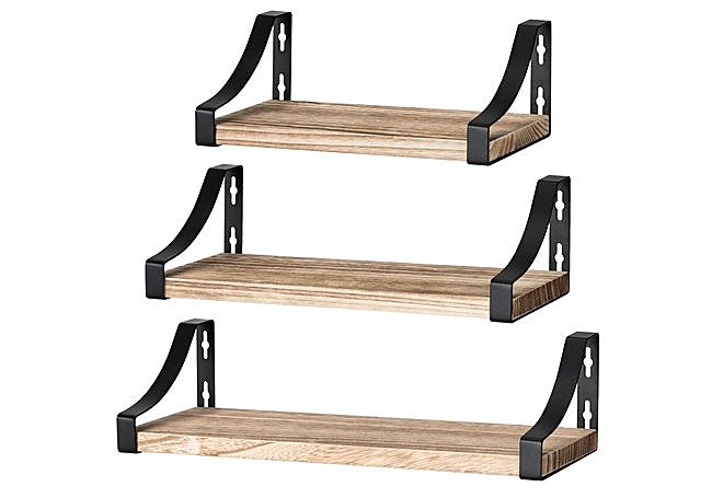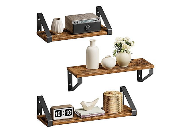 Con una estructura de tablero aglomerado y soportes de acero negro mate, este juego de estantes flotantes VASAGLE tiene un diseño rústico y una estructura robusta. Incluye tres baldas de diferentes tamaños, cada una capaz de soportar hasta 10 kg. El sistema de montaje tiene dos posiciones, lo que ofrece flexibilidad para adaptarse a tus necesidades.
