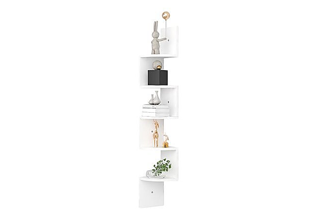 Con un diseño en zigzag y estantes curvos en blanco, esta estantería esquinera de pared VASAGLE de cinco niveles está fabricada con materiales resistentes y soporta hasta 6 kg por balda. Permite aprovechar el espacio vertical sin ocupar superficie en el suelo. Incluye un sistema de montaje sencillo, instrucciones claras y presenta un acabado minimalista.