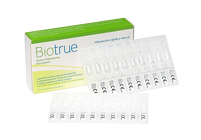 Biotrue es un producto monodosis sin conservantes diseñado para el cuidado ocular. Contiene un 0,2% de ácido hialurónico, que proporciona hidratación y reduce la irritación ocular. Es compatible con lentes de contacto, lo que permite una visión clara y confort.