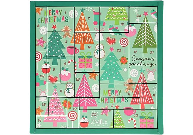 Con un diseño tipo rompecabezas, este calendario de adviento de maquillaje de ZMILE Cosmetics presenta 24 sorpresas veganas, desde sombras y esmaltes hasta pinceles y accesorios. Cada compartimento protege el contenido y facilita el acceso diario. El calendario cuenta con un formato compacto y variado, que incluye diferentes productos de maquillaje y accesorios distribuidos en compartimentos individuales.