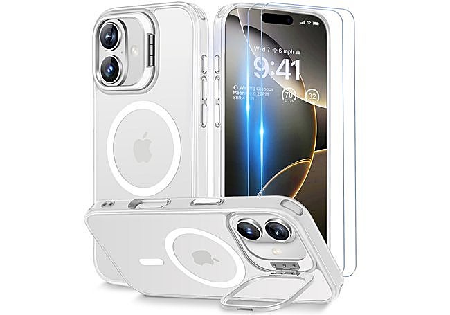 Incluye dos protectores de pantalla de cristal templado que protegen frente a arañazos y huellas sin perder sensibilidad. El soporte, integrado alrededor de la cámara, permite colocar el móvil en vertical u horizontal, facilitando videollamadas o sesiones multimedia. Todo con un estilo elegante y discreto, ideal para aprovechar al máximo tu iPhone 16.