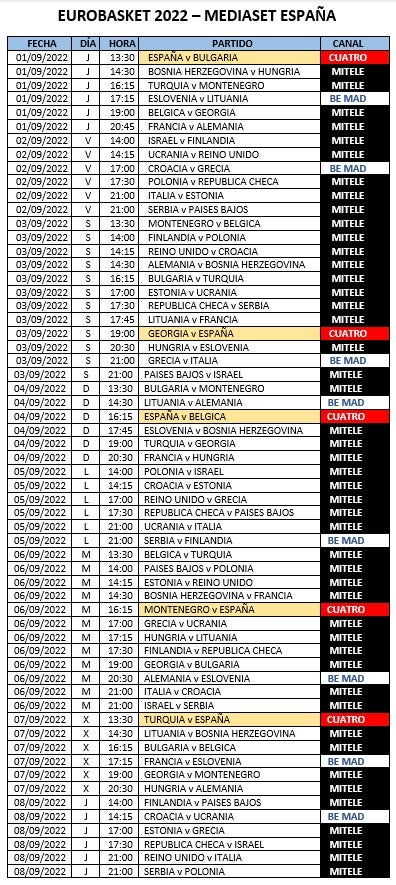 El Eurobasket, que comienza este jueves, se podrá ver a través de los diferentes canales de Mediaset. Los partidos serán retransmitidos en Cuatro (en el ... caso de los choques en los que participa España), BeMad y en la plataforma online de 'streaming' MiTele.es; es decir, a través de internet y mediante un dispositivo electrónico.