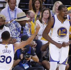 Durant celebra un punto junto a Curry.