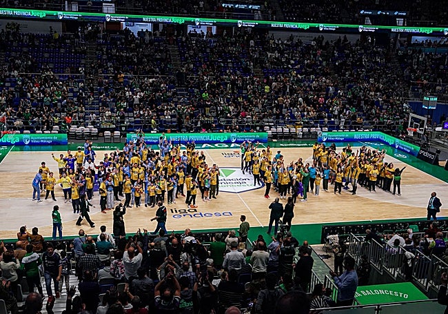 Tras las primeras actividades para los participantes y sus familiares, por la tarde llegó el colofón del día con la asistencia de todos ellos al encuentro de Liga Endesa entre Unicaja Baloncesto y Baxi Manresa. Durante el partido, que ganó el conjunto de Ibón Navarro, se desarrollaron nuevas actividades para dar visibilidad al proyecto de los ex jugadores y campeones del mundo delante de las más de 9.000 personas que asistieron al Pabellón José María Martín Carpena. Así, fueron varios los chicos y chicas que bajaron al banquillo local para saludar a los jugadores durante la presentación, se bajó a la pista en el descanso con los cerca de 200 participantes para saludar a todos los presentes y se jugó un pequeño partido de baloncesto entre el tercer y cuarto periodo, todo esto acompañado además de la celebración del Día Mundial de la Infancia en la que también posaron muchos de ellos junto a los jugadores de ambos equipos.