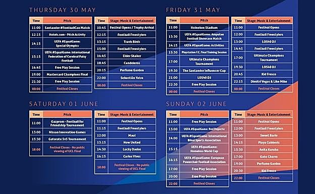 Hasta que el 1-J el esloveno Damir Skomina decrete el inicio del partido, al menos podrán de disfrutar de algunas actividades que ha montado UEFA en la ciudad con sus patrocinadores desde actuaciones en directo en la Puerta del Sol (Carlos Vives, Sebastian Yatra, Dimitri Vegas y Like Mike) hasta partidos de demostración en el campo de la Plaza Mayor en el que también habrá leyendas de la competición que también harán sesiones de firmas de autógrafos.
