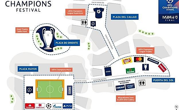 La tienda más grande con merchandaising de la final estará en Plaza Callao mientras que en la plaza de Oriente habrá un lugar preferencia para aquellos que busquen un selfie con el trofeo gigante. Algunos de los patrocinadores (Heineken y Playstation) ofrecerán la posibilidad a los asistentes de conseguir entradas para la final en sus stands en la capital.