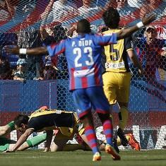 El partido acabó con un enfrentamiento entre jugadores de ambos equipos después de que Pape Diop bailara delante de los aficionados del Atlético de Madrid. ... Al finalizar el hoque el jugador pateó el balón hacia la grada y alzó los brazos ante una sector de los 8.000 seguidores rojiblancos que se habían desplazado al Ciutat de València. Los seguidores más cercanos protestaron y le increparon. Diop se llevó la mano a las orejas y con un gesto animó a los aficionados para que siguieran con su actitud. Mientras continuaron los gritos hacia Diop, el senegalés dedicó unos gestos a modo de baile y Godín se dirigió al jugador del Levante para reprocharle su actitud de manera enérgica. Finalmente fue Diego Costa quien se llevó a Diop lejos del tumulto, aunque el granota se volvió de nuevo contra los aficionados de la grada.