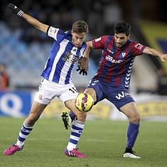 Respondió el equipo donostiarra instantes después con el saque de una falta cometida sobre Carlos Vela y remate de Agirretxe en inmejorable posición y, nuevamente para decepción de la hinchada realista, fuera del marco eibarrés.