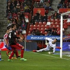 Una falta de Vranjes a Muniain unos metros más allá del ángulo derecho del área grande de la portería de Cuéllar fue lanzada por Beñat, que sorprendió al portero rojiblanco, que había dado un paso al centro de la portería, mientras el balón se colaba por donde estaba un segundo antes.