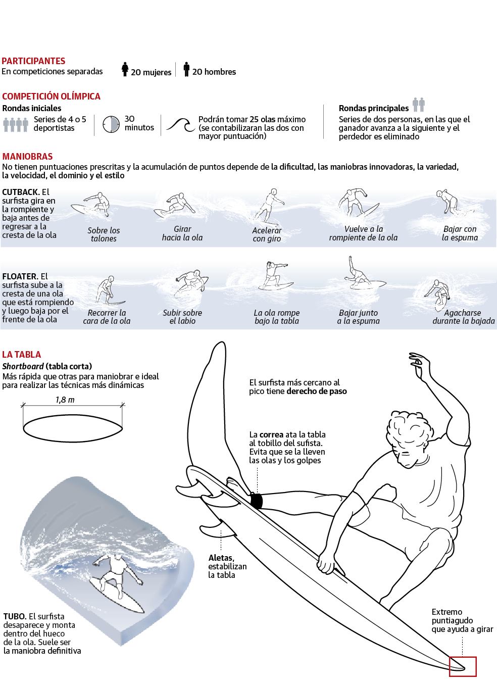 El surf se sube a la ola de Los Juegos Olímpicos en Tokio y la playa de Tsurigasaki, a 100 kilómetros de la capital, dictará sentencia. Este deporte es uno de las cinco que se estrenan en esta edición y cuenta con diferentes categorías, según el tipo de tabla utilizada y su tamaño. Será el shortboard el primero en hacer historia y los deportistas surfearán sobre la característica tabla de punta puntiaguda que ayuda a girar, es más rápida a la hora de maniobrar e idónea para llevar a cabo las técnicas más dinámicas. Serán 40 surfistas, separados en categoría masculina y femenina (20 y 20), los que competirán en esta disciplina. Y no habrá españoles este año.