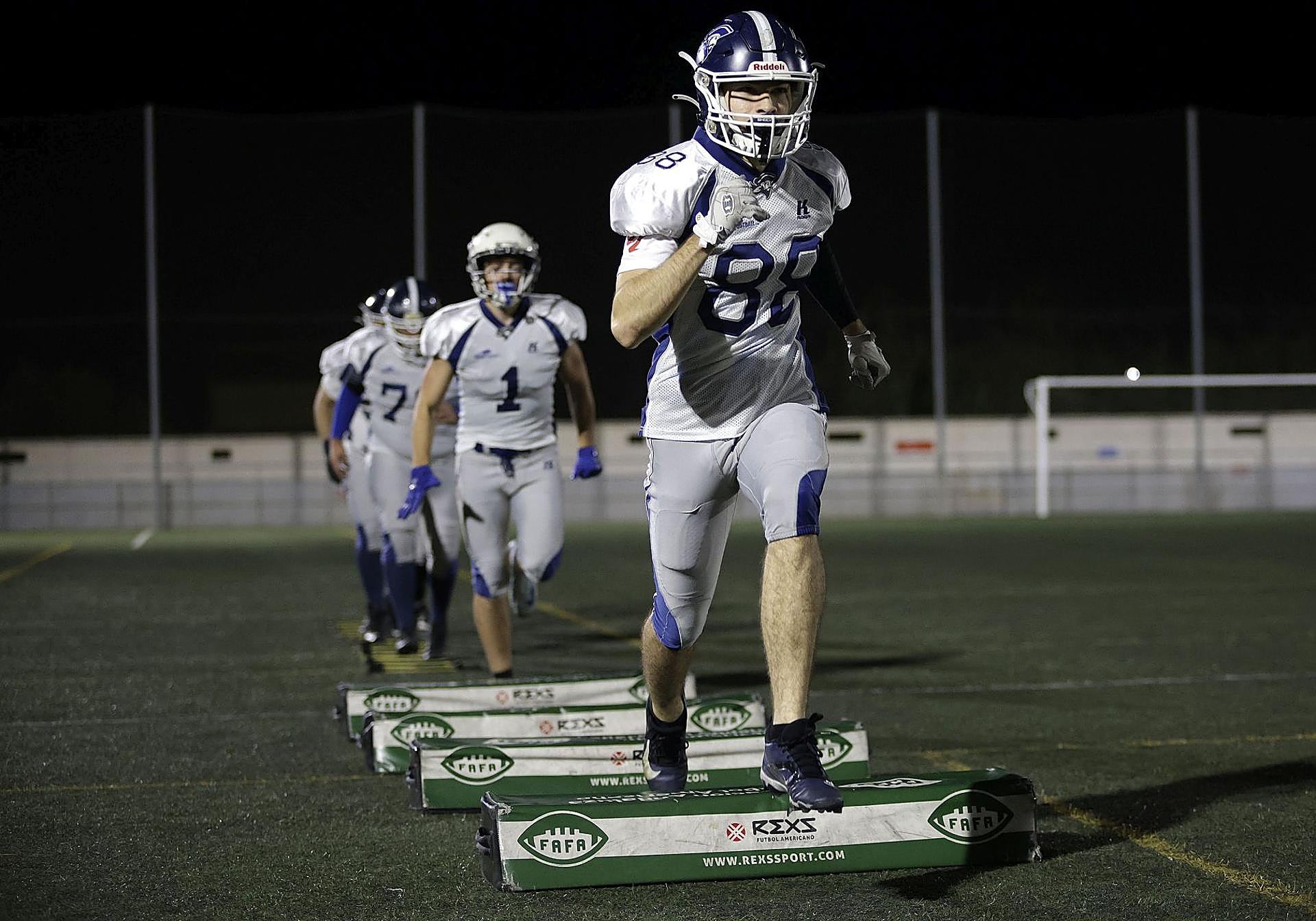 A continuación, el equipo se divide en posiciones. En una esquina del campo, la línea, el corazón del equipo. No aparecen en las fotos, porque no anotan touchdowns, pero sin su trabajo en el campo sería imposible que las jugadas salieran según lo planeado. Frente a ellos, en las otras esquinas del campo, quarterbacks, receptores y runningbacks (o corredores) entrenan por separado; ellos sí salen en las fotos. Los primeros son el cerebro del equipo. Se encargan de pasar el balón a un receptor, aunque también pueden dárselo a un corredor o incluso salir en carrera ellos mismos.