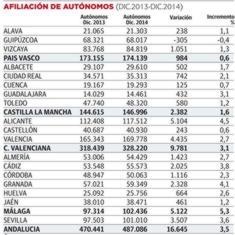 Por comunidades autónomas, todas cerraron el periodo con aumento en el número de cotizantes al Régimen Especial de Trabajadores Autónomos, siendo Canarias (4,1%), Islas Baleares (3,8%) y Andalucía las que lideraron dicho aumento. La Comunidad andaluza registró un crecimiento del 3,5% en el número de autónomos desde diciembre de 2013 al mismo mes de 2014, situándose como la tercera autonomía con mayor aumento, al pasar de 470.441 trabajadores por cuenta propia a 487.086, lo que arroja un incremento en 16.645.