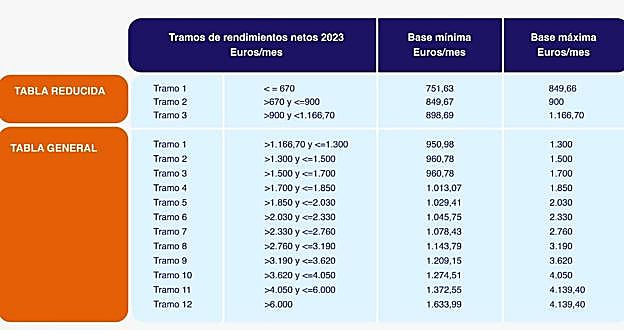 Con la reforma anunciada las cuotas mensuales a la Seguridad Social irán desde los 230 a los 500 euros al mes en 2023, y de los 200 a los 590 euros al mes en 2025, siempre en función de los rendimientos netos.