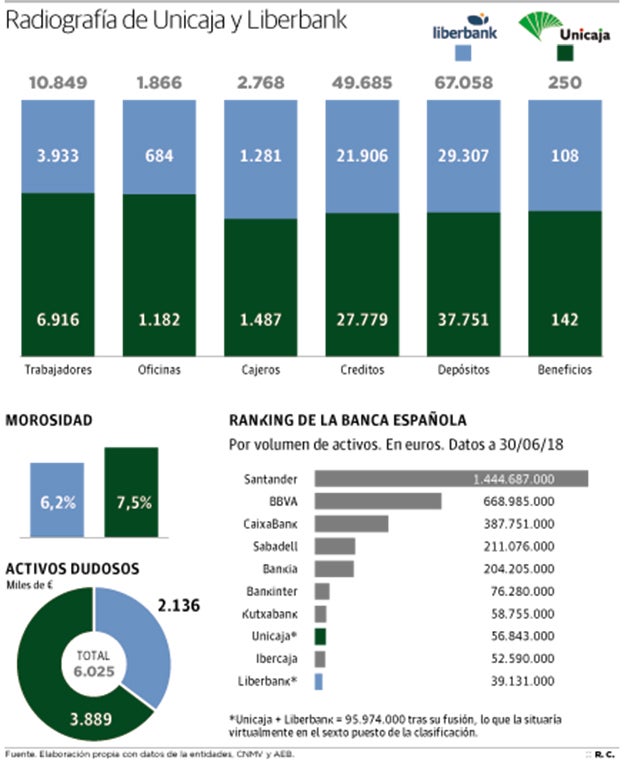 La antigua caja nacida de la fusión que lideró al frente de Cajastur Manuel Menéndez, actual consejero delegado de Liberbank, inició su cotización en Bolsa en la primavera de 2013. Su cuota de mercado alcanza el 31 por ciento en Castilla-La Mancha, el 30 por ciento en Cantabria, el 26 por ciento en Asturias y el 23 por ciento en Extremadura. En estas cuatro regiones suma 1,8 millones de clientes. Por su parte, Unicaja Banco, que formalizó el pasado septiembre la absorción de Banco Ceiss, opera principalmente en Andalucía y Castilla-León, donde tiene el 18 % y el 25 % de cuota de mercado respectivamente y supera los tres millones de clientes. De producirse la integración de las dos entidades, la cuota de mercado sería del cuatro por ciento en el conjunto nacional. Entre enero y septiembre pasados, Liberbank obtuvo un beneficio neto de 108 millones de euros, impulsado por la mejora de todos los márgenes de la cuenta de resultados y un mayor dinamismo de la actividad comercial bancaria típica. Sin embargo, el año 2017 registró pérdidas de 270 millones registradas en el mismo periodo de 2017 motivadas por la necesidad de fuertes saneamientos. Liberbank ha intensificado su estrategia de mejora de la calidad de los activos, que le ha permitido reducir en un año la tasa de mora en 4,37 puntos porcentuales, bajándola hasta el 6,2%. En el caso de Unicaja Banco, tras una reducción de 1,2 puntos en el tercer trimestre del año, se situó en el 7,5%. La suma de los activos dudosos de ambas entidades supera los 6.000 millones de euros.
