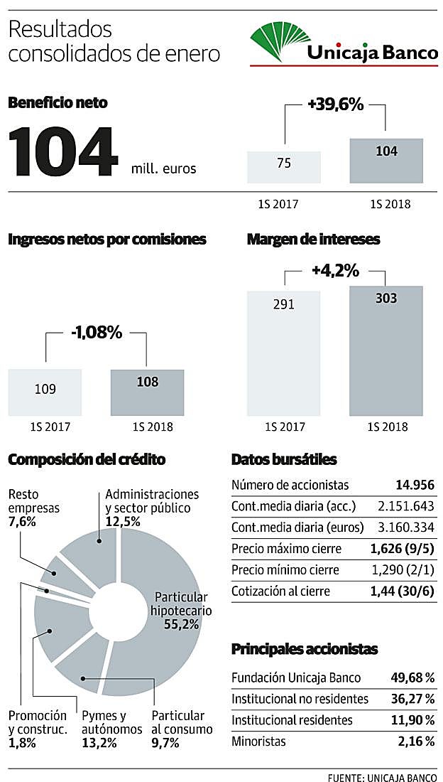 El Grupo Unicaja Banco cerró el primer semestre del año con un beneficio después de impuestos de 104 millones de euros, un 39,6 por ... ciento más que entre enero y junio de 2017. La comparativa anual reduce el incremento al 22,9 por ciento si se considera sólo el beneficio atribuido a la matriz, el negocio propiamente bancario. Los resultados presentados ayer son los primeros interanuales como grupo cotizado y representan una rentabilidad sobre recursos propios (ROE) del 5,5 por ciento (el objetivo planteado en su día a los inversores es alcanzar el 8 por ciento en el 2020). El banco que preside Manuel Azuaga atribuye este buen comportamiento, que se extiende al de los indicadores de riesgo, solvencia y fortaleza financiera «al incremento de las operaciones generadoras de ingresos y a la reducción de costes de financiación, posibilitando compensar el efecto que los bajos tipos de interés están teniendo sobre la rentabilidad media de las inversiones crediticias», explica la entidad.