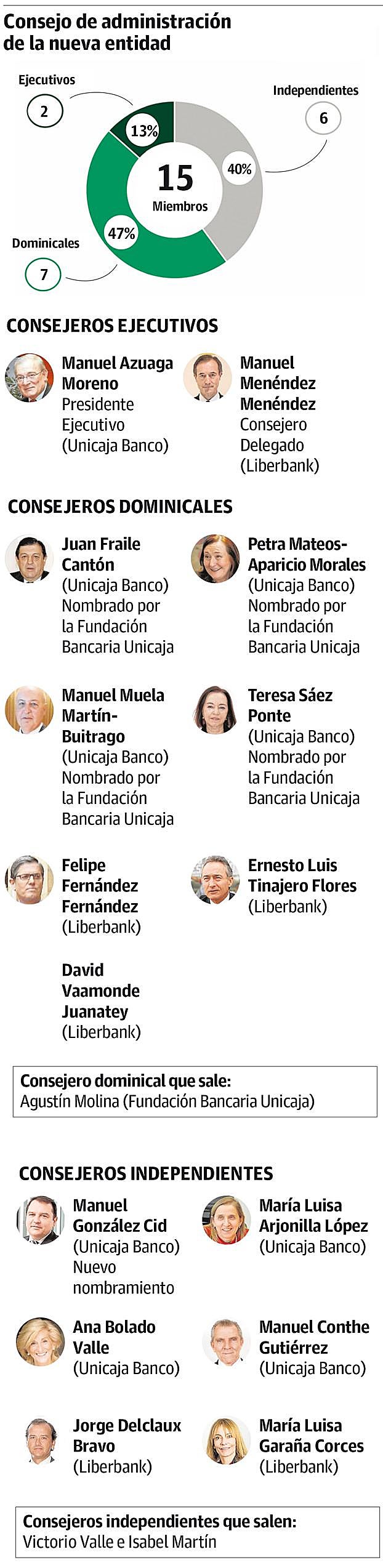De los 15 miembros que integrarán el consejo de administración de Unicaja Banco tras la fusión por absorción, dos serán consejeros ejecutivos, siete dominicales y seis independientes. En cuanto al reparto por entidades, nueve serán nombrados por la entidad malagueña y seis, por Liberbank. La constitución del nuevo órgano de gobierno se materializará a través de la renovación parcial del actual consejo de Unicaja Banco, al ser la entidad absorbente. Tendrá de presidente ejecutivo a Manuel Azuaga, actual presidente ejecutivo de Unicaja Banco, y de consejero delegado a Manuel Menéndez, actual consejero delegado de Liberbank.