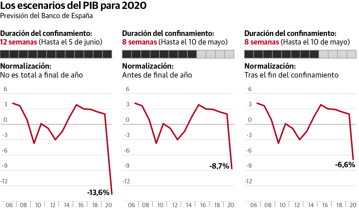 La crisis sanitaria global ha dado paso a una crisis económica mundial. El Banco de España reconoce que las medidas adoptadas para reducir las pérdidas ... de vidas humanas han conducido a la «paralización de parcelas importantes de la actividad y, por tanto, a una caída profunda y repentina del PIB». El organismo propone diferentes escenarios, dependiendo de la duración del confinamiento de la población y la vuelta a la normalidad de la actividad.