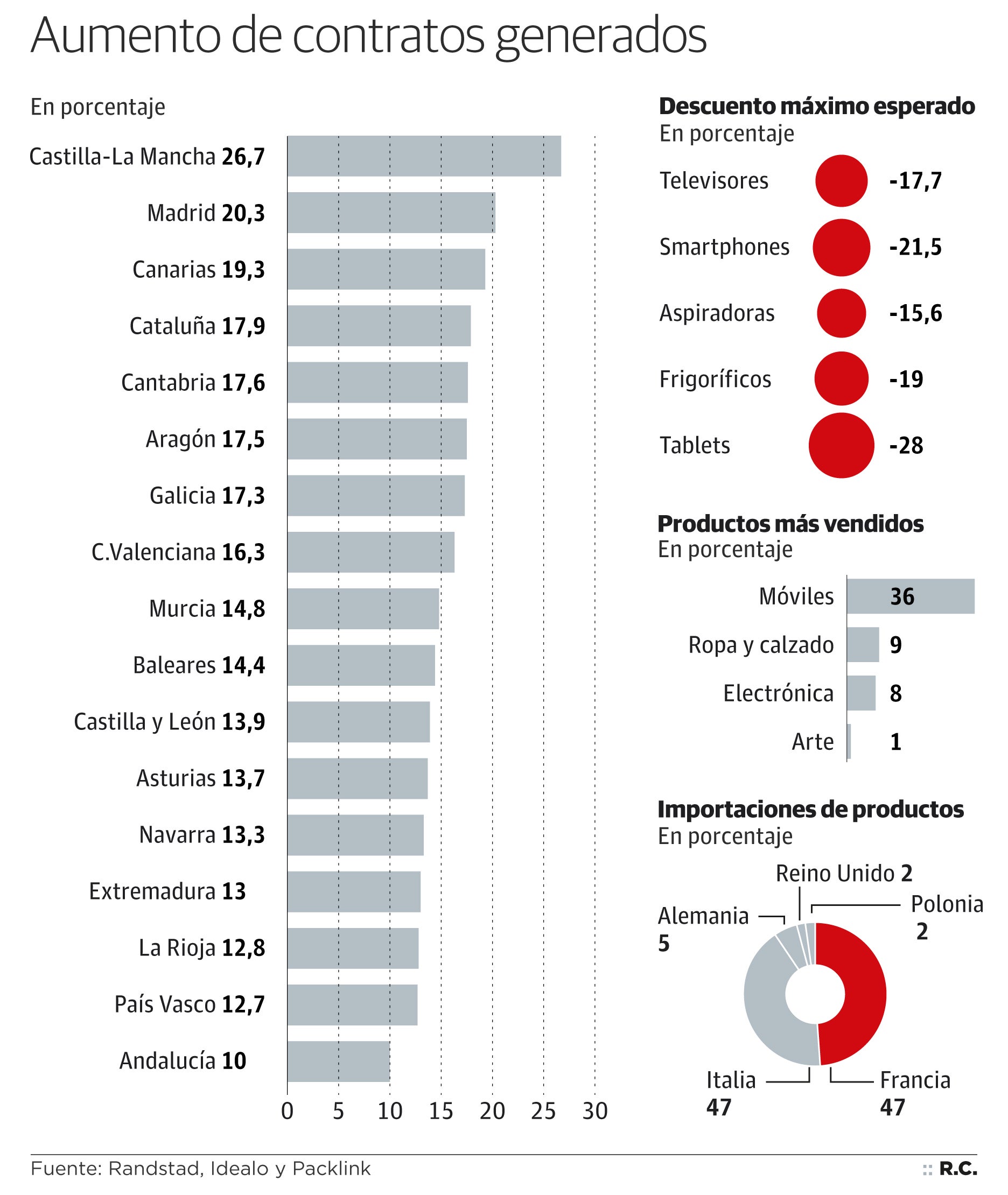 Los productos que más se venderán el próximo viernes serán los móviles (36%), según datos de Packlink. Le sigue la ropa, calzado y complementos (9%), los artículos electrónicos (8%) y el arte (1%). Según un estudio realizado por Milanuncios, cada español comprará de media dos dispositivos durante este día. Las compras 'online' seguirán siendo las líderes, según las previsiones de SEMrush, sobre todo teniendo en cuenta que se trata de descuentos de un solo día y, a diferencia de las tiendas físicas, internet está abierto las 24 horas.